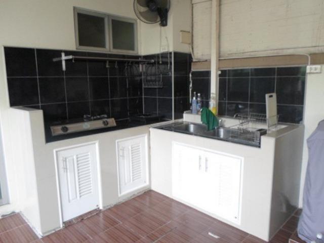 มีครัวบิวท์อิน ภายในบ้าน เคาน์เตอร์ปูน หลังบ้านทำครัวไทย วัสดุปูพื้นชั้นล่างแกรนิตโต้ชั้นบนลามิเนต